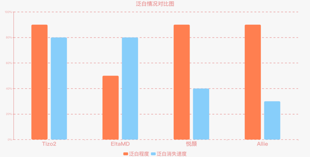泛白:都存在泛白情況。EltaMD的泛白程度很輕微,消失速度很快。悅顏和Al泛白程度比較嚴(yán)重,消失的速度慢。