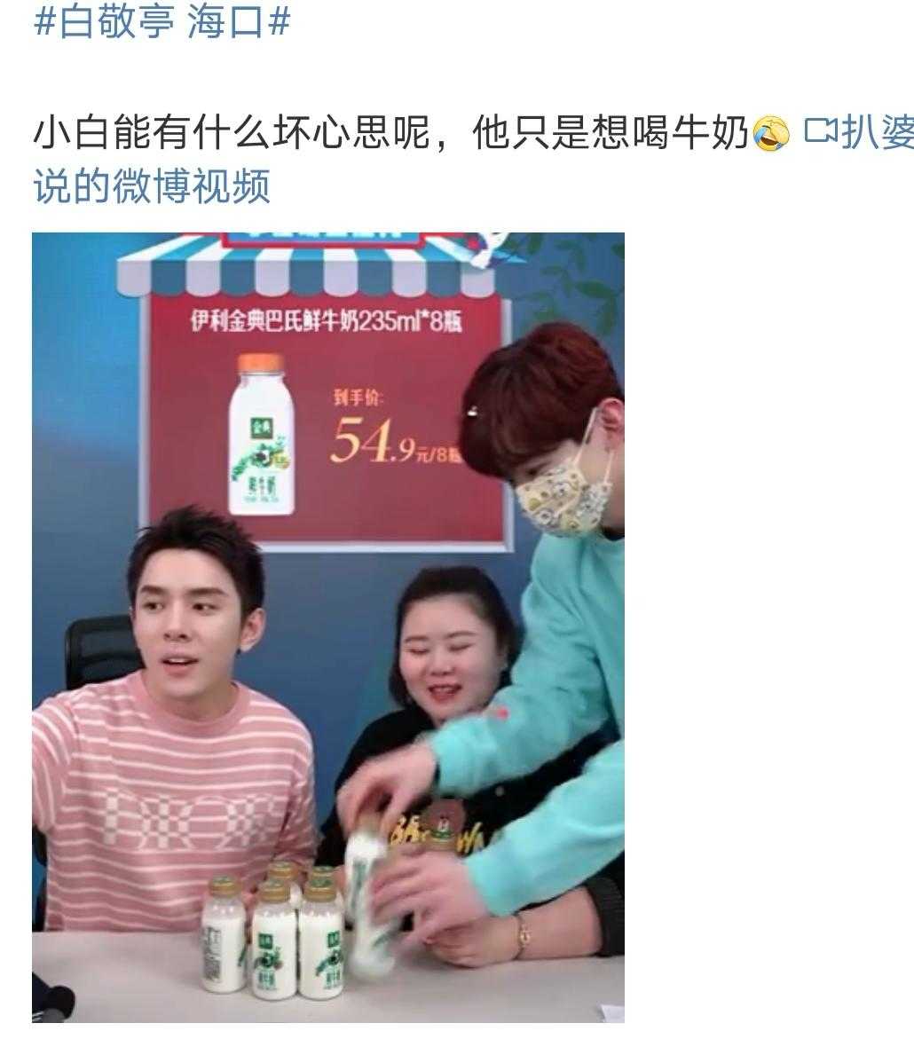 ????小白定好的是晚上10點(diǎn)鐘直播,到了約定的10點(diǎn),上一個(gè)商品還沒有播完,白敬亭戴著可愛的口罩就開始扮演工作人員,上來搬牛奶趕人了: