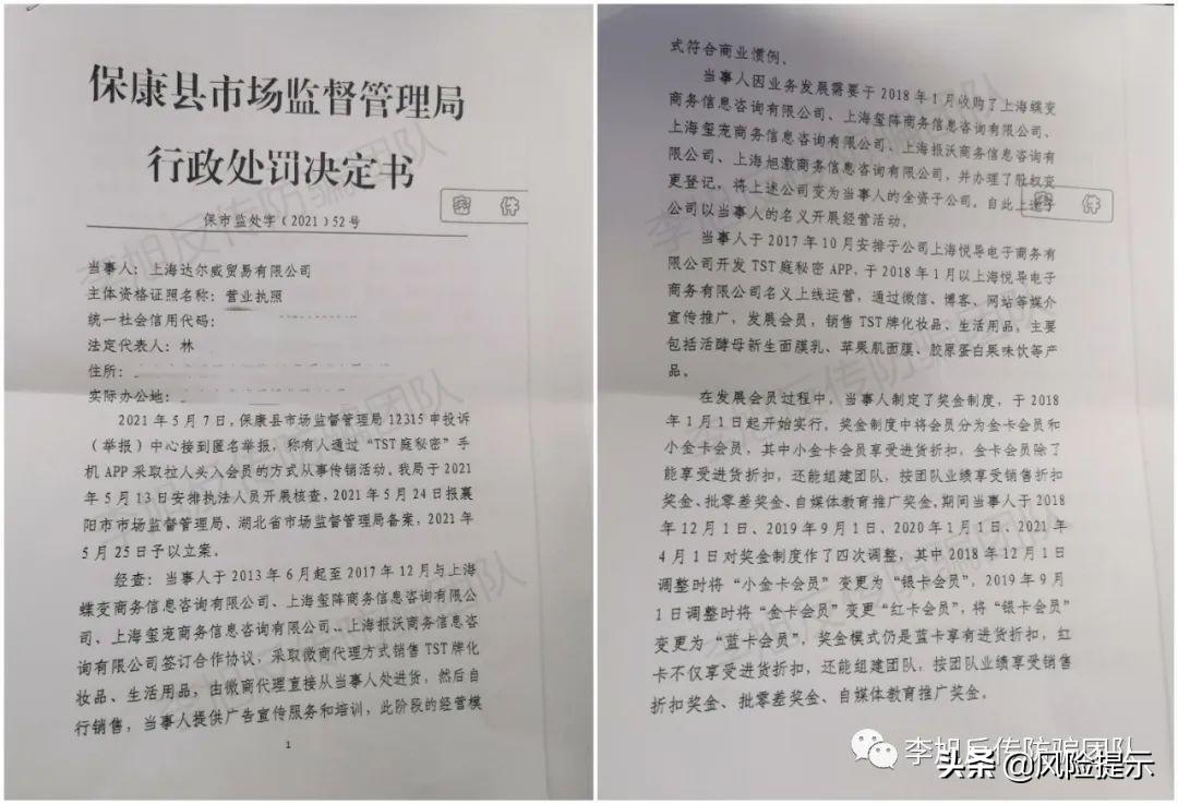 近日,李旭反傳防騙團(tuán)隊(duì)再次接到知情人士透露,其實(shí)在2021年9月,“TST庭秘密”就因涉嫌傳銷被保康縣市場(chǎng)監(jiān)督管理局行政處罰過(guò),立案信息在企查查依舊顯示。