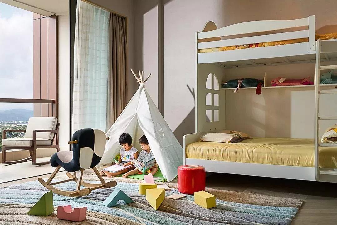 酒店還有家庭親子套房,整體布置童趣十足,設(shè)有清新自然的海洋主題兒童臥室及浴室,連衛(wèi)浴設(shè)施都是特別為小朋友量身打造,還有小帳篷、搖搖木馬玩偶、兒童智力拼圖積木等等,小朋友入住估計(jì)都舍不得出門啦!此外,酒店還有一個(gè)帶雙層滑梯的套房特別搶手!