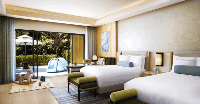 客房面積60㎡起跳,大床1.8/雙床1.35,陽臺寬大,視野開闊,觀景套房各有特色,私家別墅更有獨(dú)立泳池。客房內(nèi)也貼心親子:提供木頭質(zhì)地的兒童床,可以一側(cè)與大床連在一起。提供小床內(nèi)的床上用品,以及兒童浴袍、兒童沙灘拖棉拖、小鴨子玩具和寶寶沐浴露等一系列兒童用品。