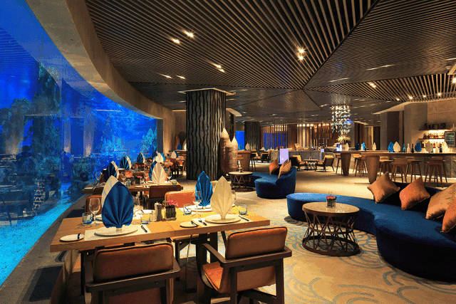 在酒店眾多餐廳中,備受客人傾心的無疑是濤·海底餐廳,猶如一座海洋館,一邊用餐一邊看繽紛多彩的魚兒游來游去,還有美人魚定時(shí)表演,還會特別游到寶貝旁邊比愛心,撒水花,這一點(diǎn)就能俘獲不少小朋友的心。白天這里還可以潛水喂魚,想體驗(yàn)的爸媽可以一試。濤·海底餐廳提供名副其實(shí)的海鮮自助午餐晚餐,品種特別多,刺身蒸煮熱炒冷盤皆有,自助午餐團(tuán)購價(jià)每位400元出頭,性價(jià)比可以說是很高了。酒店還設(shè)有專門的觀光通道,不在此用餐的住客也可以欣賞曼妙的海底世界。