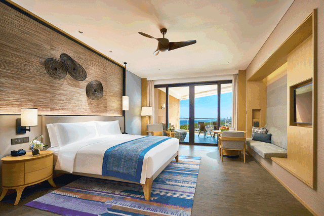 客房現(xiàn)代時(shí)尚,寬敞舒怡,配有大沙發(fā)和大大的陽臺,海景房躺在床上就能看海。酒店還有五彩斑斕的陽臺花園主題親子房,配有小帳篷兒童玩具等,將“兒童樂園”搬進(jìn)了客房, 想要給孩子專屬的玩樂天地和驚喜可以選擇入住。