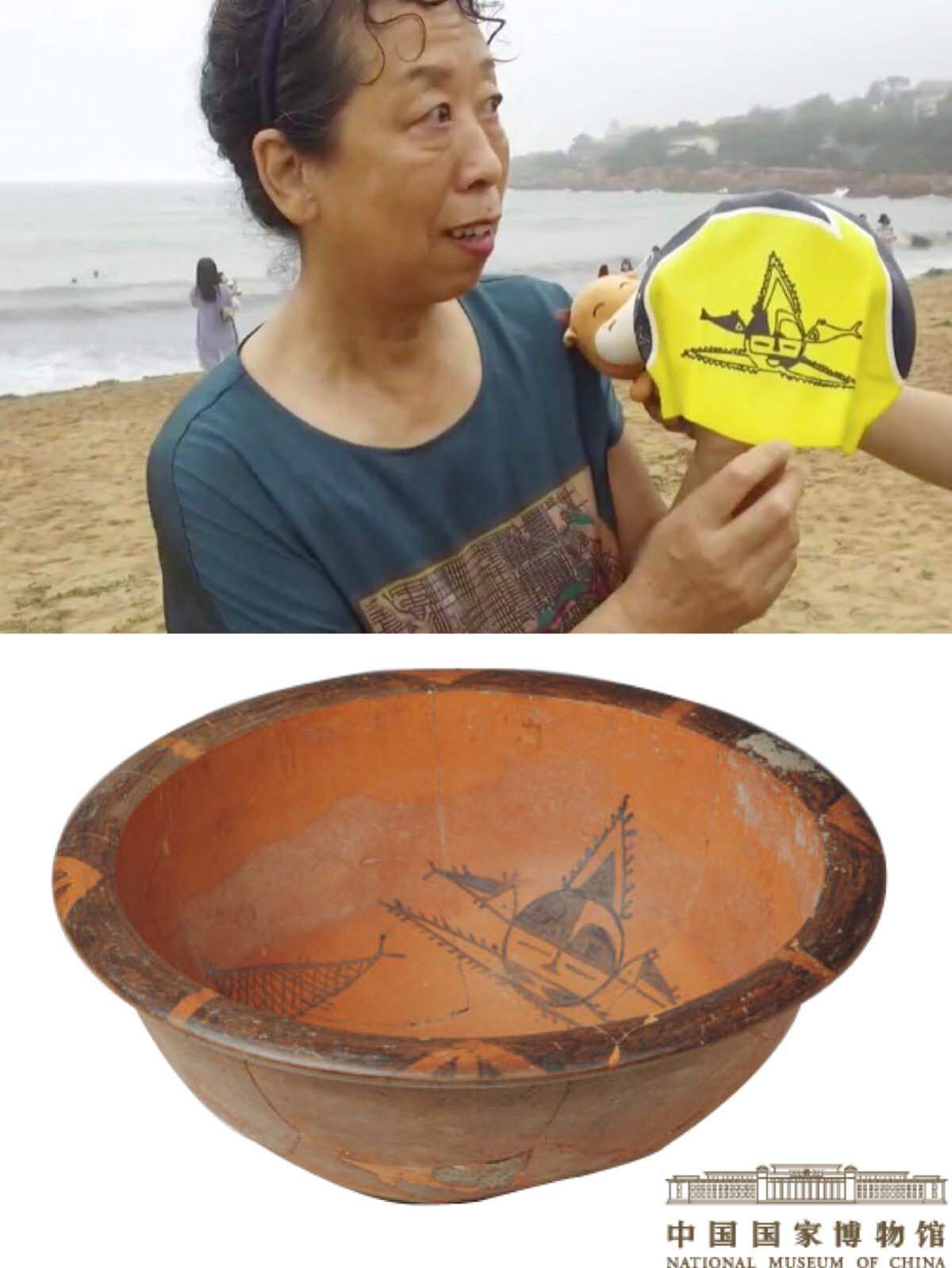 在面向千萬(wàn)淘寶天貓商家同行分享經(jīng)驗(yàn)的千牛直播中,夫妻倆還展示了新一款泳帽,主題是新石器時(shí)代前期仰韶文化的人面魚紋彩陶盆。
