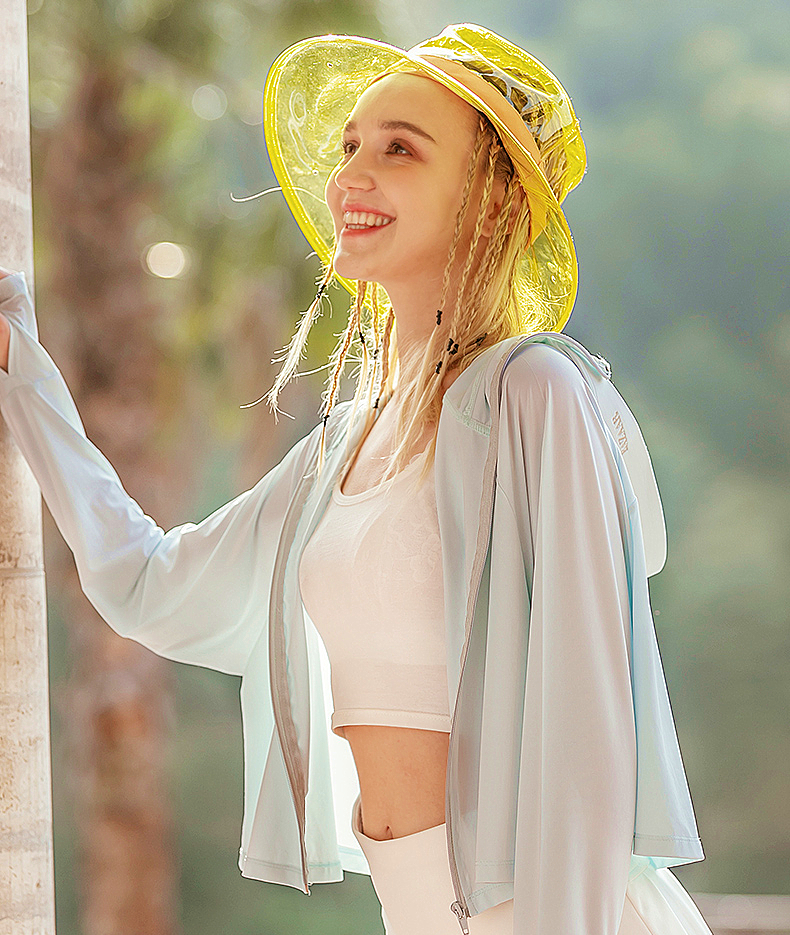 穿上這件防曬服,頭發(fā)可以直接取出帽外