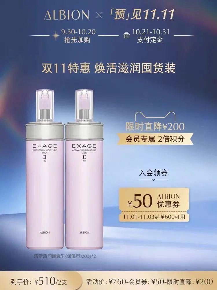 禮贈:①買1支50ml正裝,送1支50ml同款正裝,實(shí)際到手乳液100ml;②原價278元,雙11預(yù)售價139元/2支