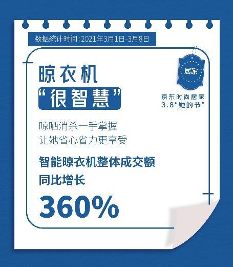 京東大數(shù)據(jù)顯示,3月1日-8日“她的節(jié)”期間,京東時尚居家彩妝套裝銷量同比去年增長13倍,美膚花灑成交額同比增長5倍,智能晾衣機(jī)整體成交額同比增長360%......時尚居家好禮無疑為女性的生活增添了更多精致、時尚氣息,并促使“禮在京東”占據(jù)了更多用戶心智。