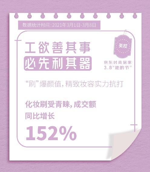 冬去春來,從“貓冬”到“賞春”,女性對于精致妝容的要求日漸提升,“全套搞定美顏”成一大趨勢。本次3.8“她的節(jié)”,京東彩妝套裝成為大熱趨勢,銷量同比去年增長13倍,“中國風(fēng)”走俏,日記小細(xì)跟口紅細(xì)管口紅禮盒、花西子x杜鵑定制東方佳人妝奩彩妝套裝成消費者愛國風(fēng)彩妝禮盒。另外,化妝刷備受青睞,銷量同比增長152%,可謂工欲善其事必先利其器,一套順手好刷,助力女性隨時“刷”出精致妝容。