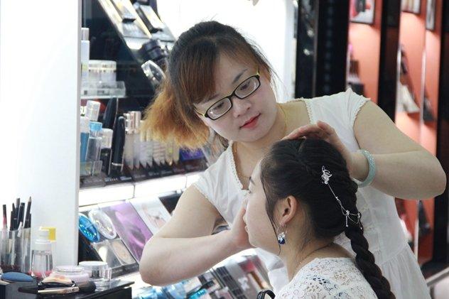 基本功過(guò)關(guān)后,彩莎對(duì)店員做彩妝體驗(yàn)的次數(shù)提出要求。店員為顧客妝前、妝后各拍一張照,發(fā)到內(nèi)部微信群,既是互相學(xué)習(xí),也統(tǒng)計(jì)每人每天畫(huà)了多少個(gè)妝,給出相應(yīng)獎(jiǎng)懲。