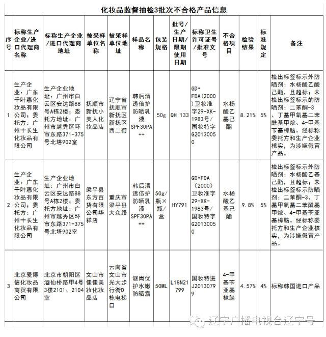 標(biāo)稱廣東千葉惠化妝品有限公司(委托方:廣州十長生化妝品有限公司)生產(chǎn)的2批次韓后清透倍護防曬乳液SPF30PA++檢出水楊酸乙基己酯超標(biāo)。這2批不合格化妝品種,其中1批次在遼寧省檢出,被采樣單位為撫順市新?lián)嵝∶廊嘶瘖y品店。而經(jīng)過對標(biāo)稱生產(chǎn)企業(yè)和委托企業(yè)的現(xiàn)場核查,2批次標(biāo)稱韓后清透倍護防曬乳液SPF30PA++的產(chǎn)品為涉嫌假冒產(chǎn)品。