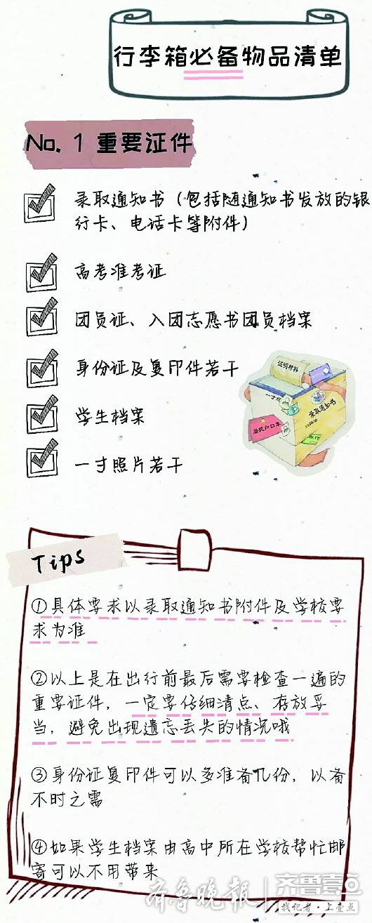 周到體貼的還有山東大學和中國石油大學(華東),兩所高校的迎新微信把新生入學需要準備的物品分門別類。在中國石油大學(華東)的微信里,新生要備的物品包括了資料文件類、生活用品(寢室類)、生活用品(洗護類)、電子產品類、常備藥物類,還有軍訓用品類。哪怕不是中國石油大學(華東)的新生,這個分門別類的行李清單也有用,只是這么多東西,一個兩個行李箱怕是裝不下了。