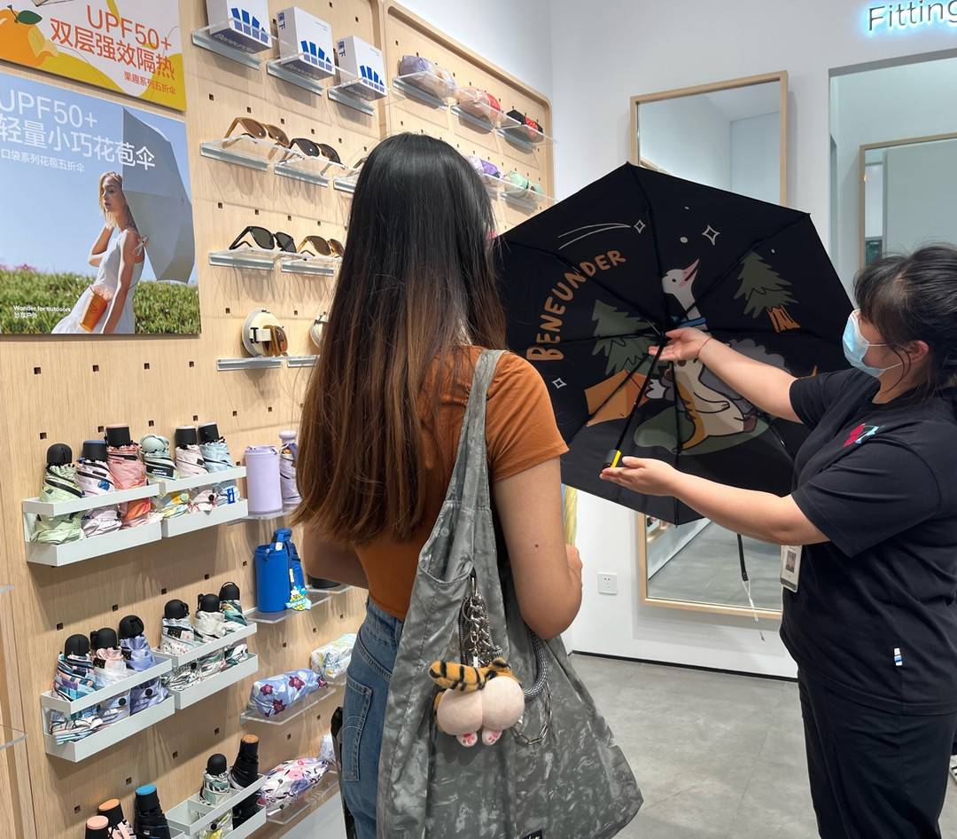 記者在店內(nèi)了解到,近期成都持續(xù)高溫,來(lái)選購(gòu)防曬用品的消費(fèi)者絡(luò)繹不絕,人多的時(shí)候,店員甚至有些忙不過(guò)來(lái)。近一個(gè)多月,防曬用品整體銷量暴增,傘、帽子、袖套都是爆款,很多人在小紅書(shū)種草了貝殼防曬帽,專門(mén)來(lái)找同款。防曬衣增長(zhǎng)快,尤其是主打款冰觸、冰薄 ,輕薄透氣,寬帽預(yù)防面部曬黑。消費(fèi)者既自用也買來(lái)送人。