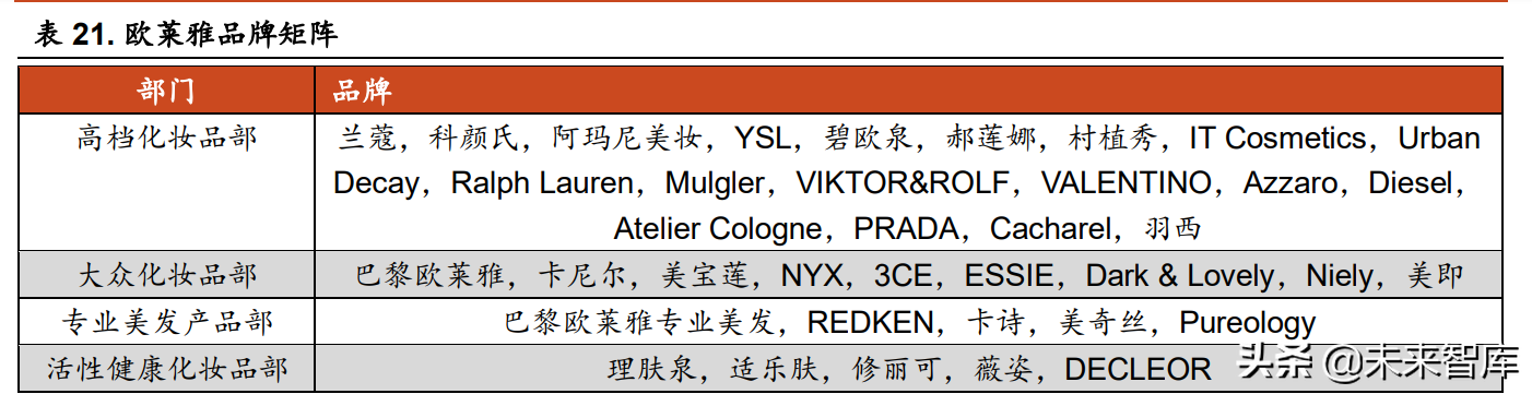 雅詩蘭黛和歐萊雅的品牌矩陣具有以下特征:1)多品類發(fā)展。產(chǎn)品品類 齊全,護膚、彩妝、香水、護發(fā)品類均有覆蓋。2)品牌定位完善。高端(La Mer,雅詩蘭黛;郝蓮娜、蘭蔻等)、大眾(MAC、Too Faced;巴黎歐萊雅、 美寶蓮等)、小眾細分市場(Aerin、La Labo 等)均有覆蓋。