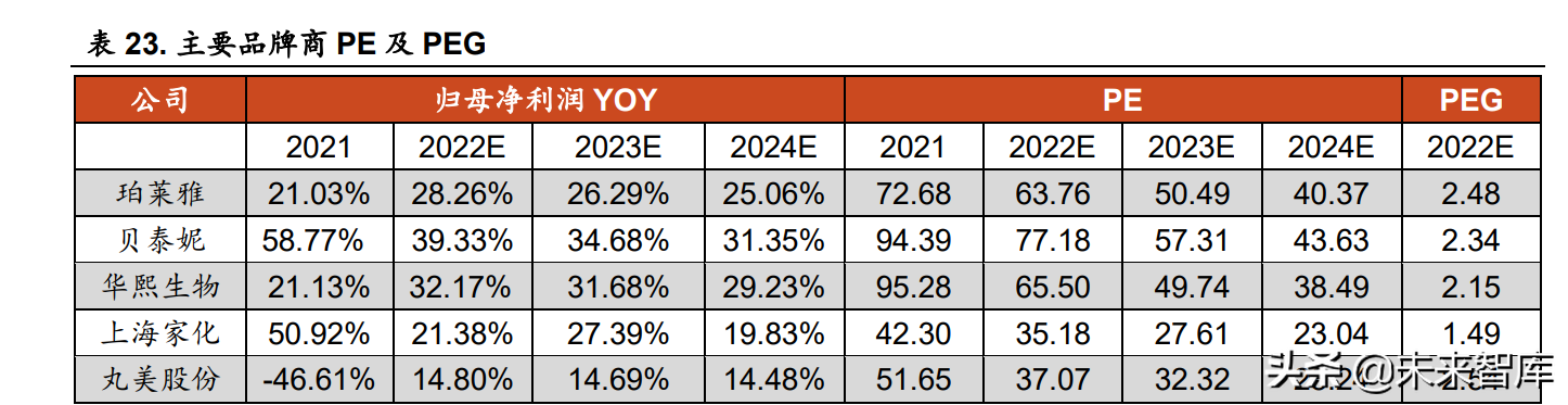 PEG 角度:品牌商 PEG 的區(qū)間范圍為 1.5-2.5X。組織架構(gòu)高,盈利 能力穩(wěn)定的公司通常 PEG 水平較高,比如珀萊雅。部分景氣細分賽道擁有 較的研發(fā)壁壘或背書壁壘,代工普及化和營銷多元化背景下,競爭格局 優(yōu)于的傳統(tǒng)化妝品賽道,存在估值溢價,通常 PEG 水平較高。比如貝泰妮所 處的敏感肌護膚賽道增速高,且顧客復購率高,皮膚科醫(yī)生背書打造薇諾娜 品牌獨特的競爭壁壘;華熙生物擁有玻尿酸研發(fā)壁壘,主打“玻尿酸+”護膚 概念,“成分黨”崛起使其功能性護膚品業(yè)務(wù)發(fā)展壯大。上海家化除經(jīng)營美容 護膚產(chǎn)品外,個護和母嬰產(chǎn)品營收占比也較高,PEG 水平低于化妝品業(yè)務(wù)營 收占比較高的公司。丸美股份過去 2 年歸母凈利潤均同比下滑,PEG 水平不 具備參考價值,PE 估值水平未超過 40-60X 估值上限。