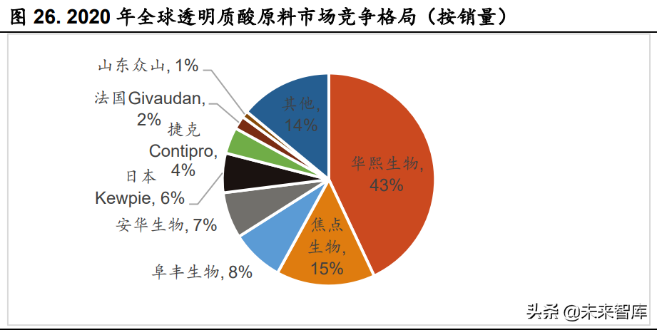 從競爭格局看,行業(yè)集中度較高,華熙生物穩(wěn)居龍頭地位。2020 年,全 球銷量排名前五的透明質(zhì)酸原料企業(yè)均為國內(nèi)企業(yè),華熙生物、焦點生物、 阜豐生物、安華生物銷量占比分別為 43%/15%/8%/7%,合計占比 73%。國 內(nèi)頭部企業(yè)擁有領(lǐng)先的技術(shù)優(yōu)勢和規(guī)?;瘞淼某杀緝?yōu)勢,出口價格低于境 外公司同等產(chǎn)品,行業(yè)格局較為穩(wěn)定。