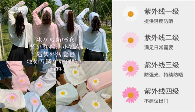變色小雛菊 檢測紫外線這種靠物理防曬原理的防曬衣,可無限次水洗,防曬果也不會有丁點減弱!