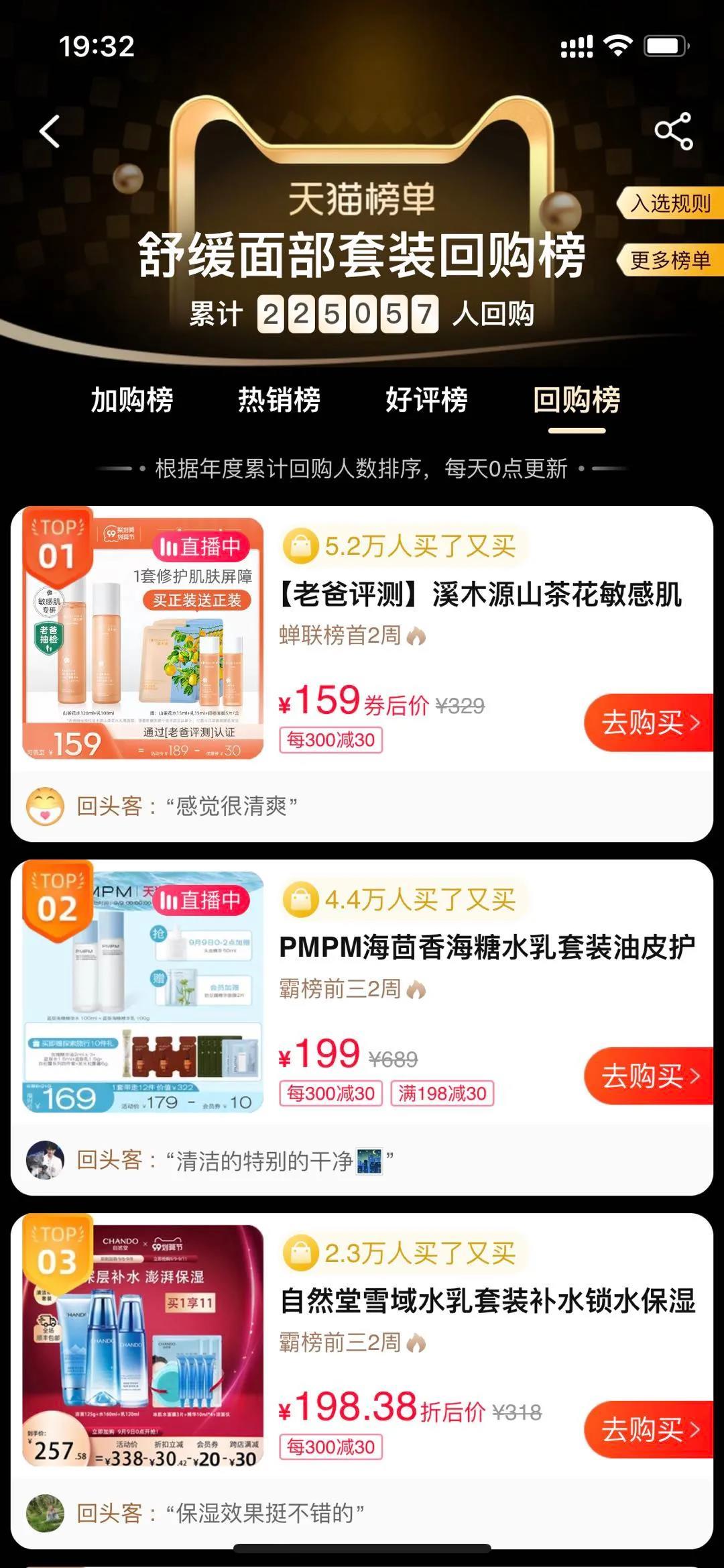 7月下旬至今,山茶花水乳套裝穩(wěn)居天貓舒緩面部套裝熱銷榜、好評榜、回購榜三榜第一名。其中,好評榜是根據(jù)近30天已購買、使用消費者的好評占總評價數(shù)的比率排序,回購榜是根據(jù)2021年度累計回購人數(shù)排序,這代表該套裝不僅賣得好,而且廣受好評,復購率也在天貓美妝。