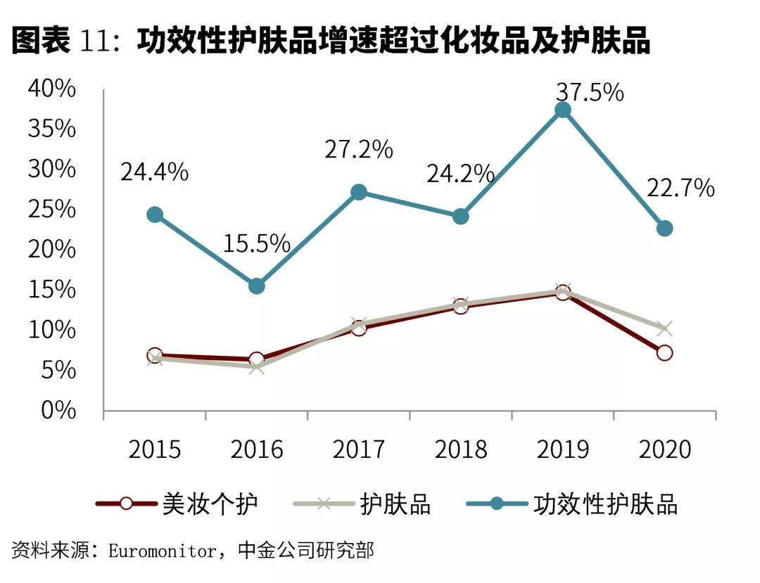 據(jù)歐睿國際數(shù)據(jù)預測,到2024年,中國功能性護膚品市場規(guī)模將突破千億元,占整體護膚品市場的22.9%。功能性護膚品市場的增長率遠超整個護膚品市場的增長率,2015-2020年,中國功能性護膚品市場的復合年均增長率達25.2%,高于同期美妝個護市場10.3%、護膚品市場10.9%的增長率,可見,功能性護膚品行業(yè)正處于快速成長期。
