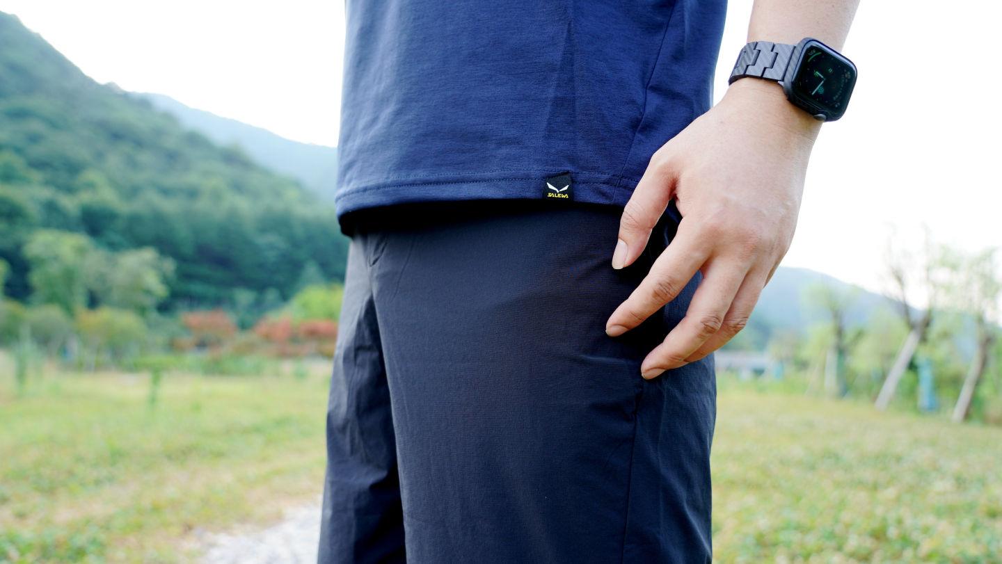接著聊聊短褲,這是一條登山或者休閑都可以穿著的褲子,采用了東麗的防潑透氣面料,和T恤一樣,具有透氣快干功能。