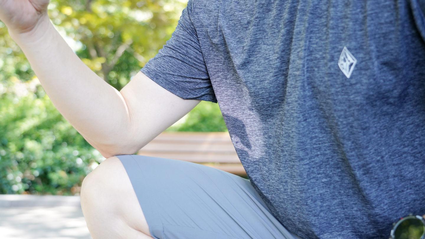 而這件T跟剛才的第一件比,排汗快干的能力稍遜,出汗之后,衣服濕的部分會(huì)呈現(xiàn)不同深度的顏色,說(shuō)來(lái)也奇怪,并不影響穿著的舒服感受,有時(shí)候甚至還覺(jué)得,適當(dāng)濕一點(diǎn),冰涼的感受更強(qiáng)了......