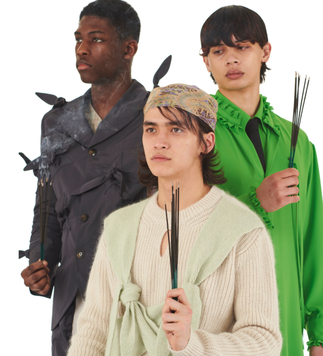 他今年的新作品【you tell me】,則是進(jìn)一步擴(kuò)充了這一設(shè)計(jì)思維:以老家泰國為藍(lán)本,結(jié)合手相、符、傳統(tǒng)的泰國紋身圖樣靈感,展現(xiàn)了對(duì)于身體病癥,泰國人民熱衷于向神明、萬物生靈中求得緩解的文化思想,創(chuàng)作了一系列極富唯心主義韻味的服裝。