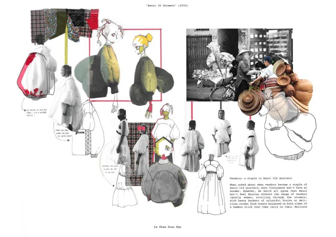 通過觀察日常生活在這里的居民與小販,Nga Le Pham特別研究了當(dāng)?shù)氐闹窬幖夹g(shù)以及人們勞碌生活中的“笨重”輪廓,將這些努力生活的精神,轉(zhuǎn)化為了自己設(shè)計(jì)中抽象的紡織品與oversize的形狀,生成了更加當(dāng)代的表達(dá)。