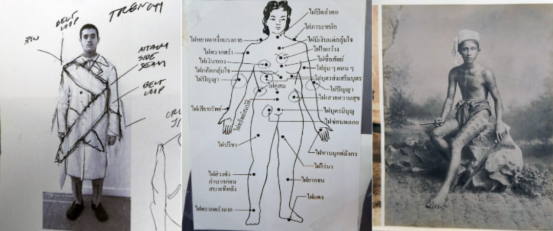 如:按照看手相算命中掌紋的走向設(shè)計(jì)剪裁衣袖形狀;襯衫上的針腳,突出的打結(jié)部位,與泰國傳統(tǒng)研究中,幸運(yùn)痣的位置相近等等。