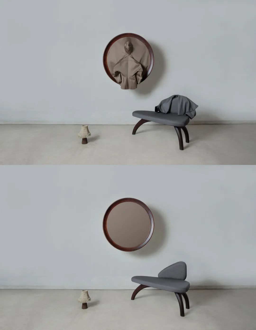 在她看來,家具也與服裝有關(guān):一個(gè)設(shè)計(jì)巧妙的圓形框架,也可以作為衣架的替代品。一件衣服長時(shí)間的掛在衣架上,二者仿佛合而為一成為藝術(shù)品雕塑的形態(tài);抑或在沙發(fā)上坐久了,人都長在上面了…這種將藝術(shù)與時(shí)尚的邊界進(jìn)行模糊的生活巧合,都是她的靈感來源。(一不小心也對(duì)covid-19的特殊時(shí)期有了種遙相呼應(yīng)。