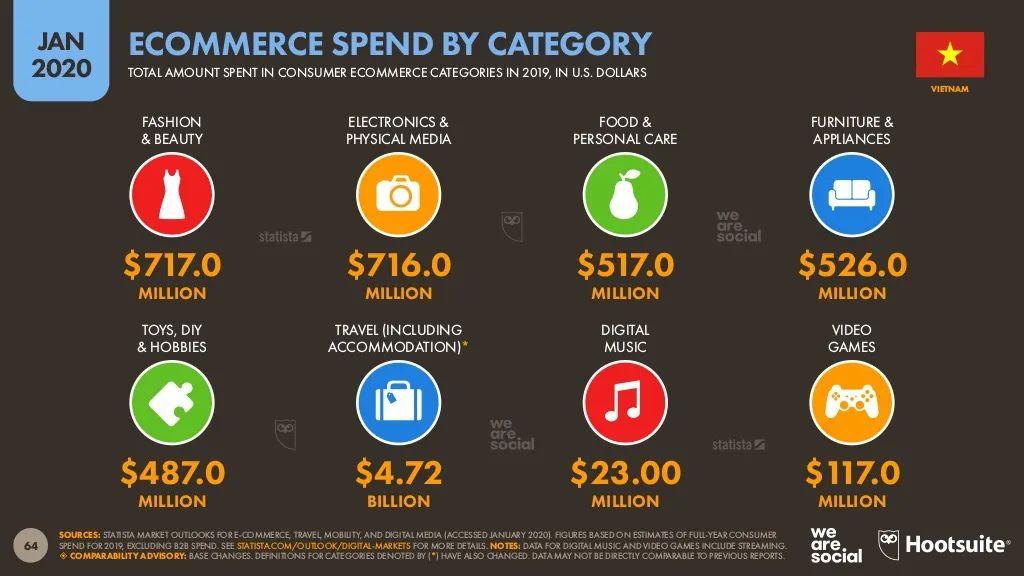 2020年越南電子貿(mào)易中時(shí)尚類消費(fèi)位列榜首,比2019年上漲17%,并在2021年達(dá)到了14.4億美元 圖源datareportal