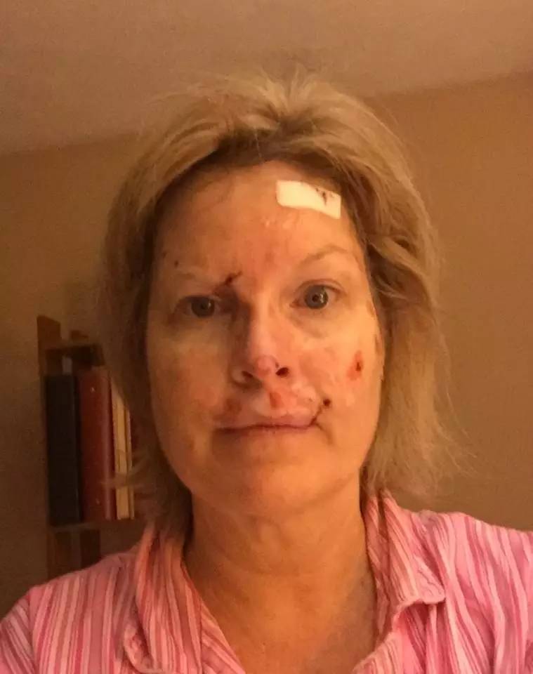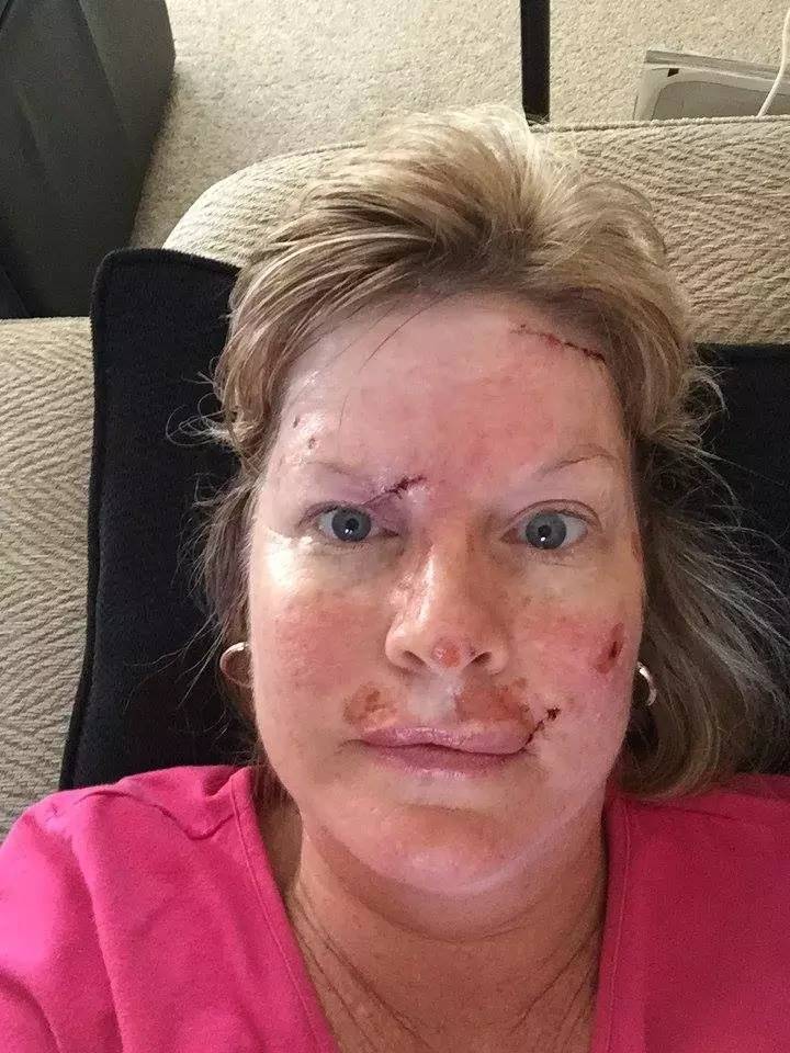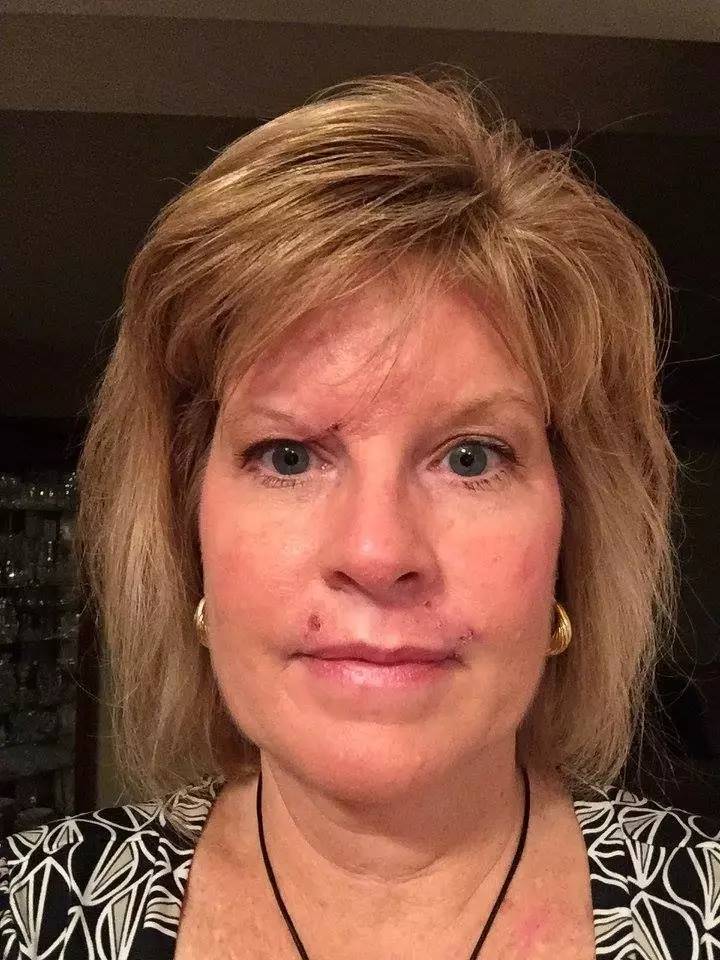 (術(shù)后6小時的臉,她嘴角和眉骨的黑色素瘤是通過手術(shù)切除的,其他還有一些是激光去除的)