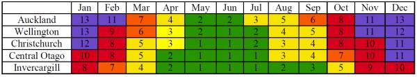 下圖是新西蘭各月份晴天時的平均紫外線強(qiáng)度,1是弱,13是強(qiáng)??梢钥吹酱合那锶镜淖贤饩€都很強(qiáng),10月到3月,7級到13級強(qiáng)度。