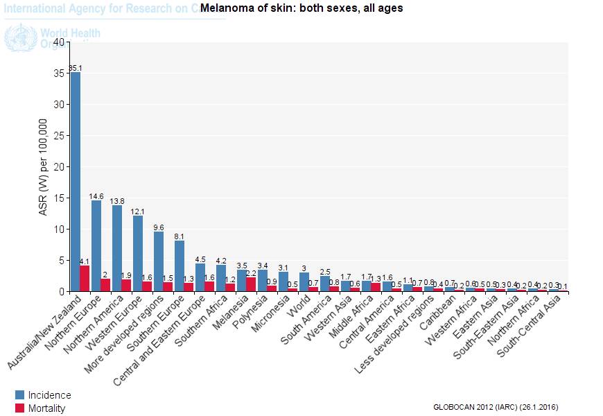 下圖是2012年的數(shù)據(jù),每十萬人中,得黑素瘤的澳洲/新西蘭人有35.1人,北美有13.8人,東亞0.3人。