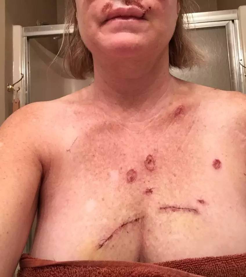 (除了面部,Judy的身上所有黑色素瘤都必須清除!這是慘不忍睹的胸口……術(shù)后5天)