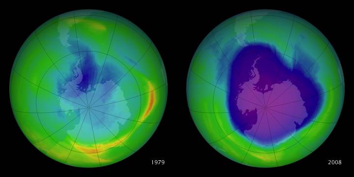 下圖是來自NASA的示意圖,南極臭氧層從1979年到2008變稀薄到現(xiàn)在的臭氧空洞。好在國際已經(jīng)禁止用氟利昂CFC以避免繼續(xù)破壞臭氧層,近兩年的臭氧層厚度有所增長。