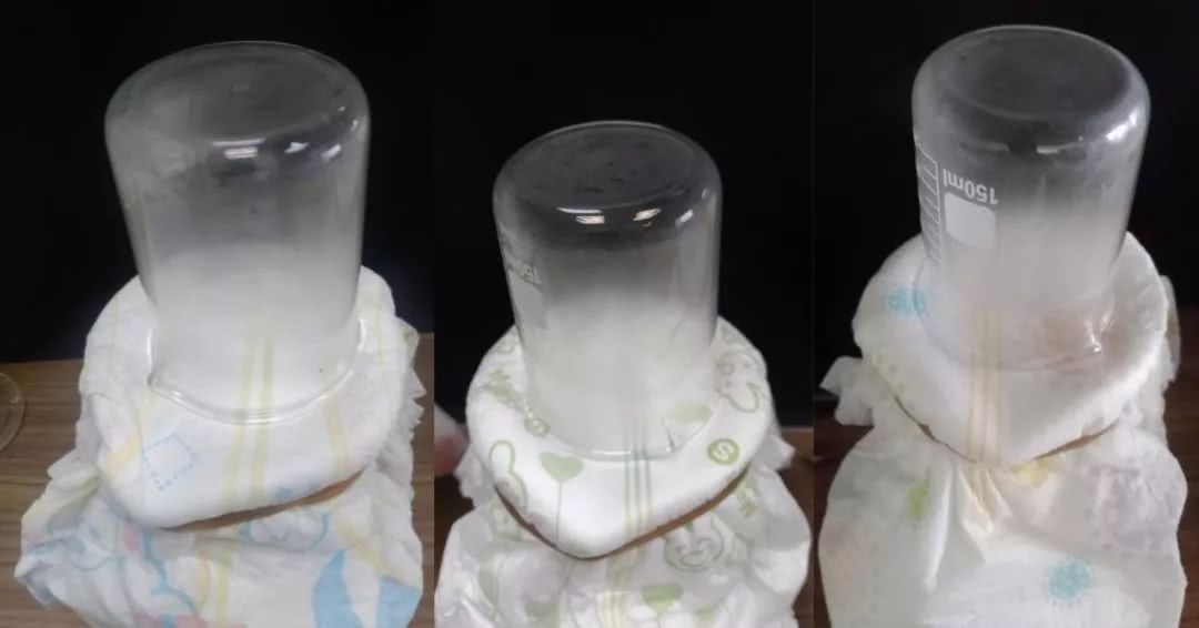測(cè)試方法:取100ml沸水至于燒杯中,將紙尿褲平攤在杯口并箍緊,將干燥的燒杯倒扣在紙尿褲上,靜置5分鐘后觀察燒杯上的水珠。根據(jù)蒸汽凝結(jié)情況判斷透氣性。