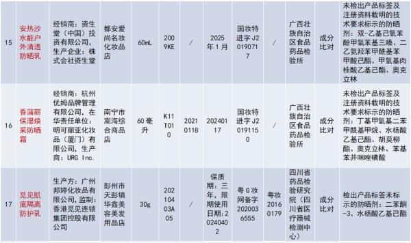 URGInc.生產(chǎn)、杭州優(yōu)姆品牌管理有限公司經(jīng)銷的香蒲麗保濕煥采防曬霜,成分比對(duì)不合格;