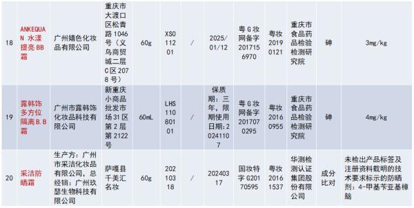 廣州市露韓飾化妝品科技有限公司生產(chǎn)的露韓飾多方位隔離B.B霜,,被檢出砷(4mg/kg);