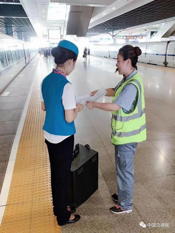 2017年7月,高鐵外賣在全國(guó)27個(gè)高鐵站上線運(yùn)行。圖為高鐵外賣配送員和乘務(wù)員交接。