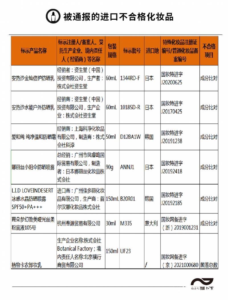 在近期官方的不合格化妝品通報(bào)中,還出現(xiàn)了多批次進(jìn)口品牌的身影。如2022年的12月22日《藥監(jiān)局關(guān)于53批次不符合規(guī)定化妝品的通告》就通報(bào)了安熱沙、愛和純、娜麗絲等6批次進(jìn)口化妝品。
