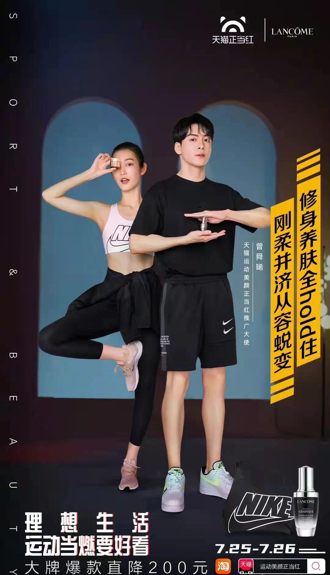 2020年,天貓開展“運動美顏正當紅”的活動,Nike×蘭蔻、匡威×歐萊雅、安德瑪×安熱沙、哥倫比亞×博朗圣泉聯(lián)名形成“CP玩法”,并在微博發(fā)起“健身素顏妝”等話題試圖打通運動與美妝。