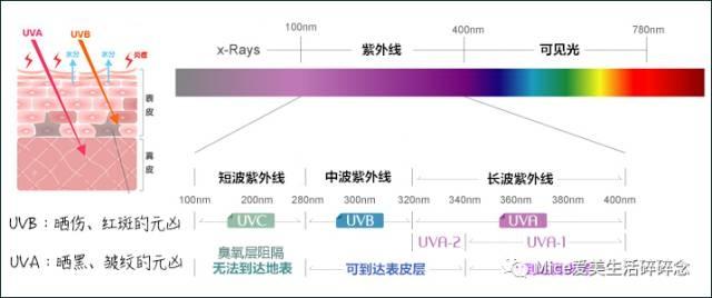 根據(jù)波長大小,又可將其分為:長波紫外線UVA(波長320-400nm)、中波紫外線UVB(波長280-320nm)、短波紫外線UVC(波長180-280nm)。少量的太陽光照射有利于人體對礦物質的吸收,預防小兒狗僂病和成人軟骨病的發(fā)生,促進體內新陳代謝,增強免疫功能。但如果長時間的將皮膚暴露于太陽光下,帶有巨大能量的紫外線將對皮膚產(chǎn)生不良的作用