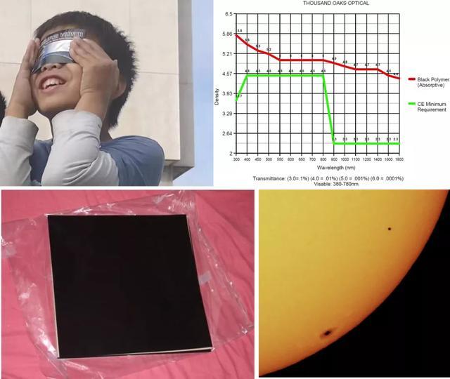 判斷濾膜果的專業(yè)術(shù)語叫吸光度(optical density),比如吸光度為5的過濾膜意味著透射率為10的5次方分之一(十萬分之一)。上圖的濾膜吸光度在4.5到5.5之間,只能透射十萬分之一的可見光和幾萬分之一的紅外線,這類鍍膜才可以被地用來觀察或拍攝日食。另一個常見參數(shù)遮光號(shade number)是吸光度乘以7/3再加上1。這項參數(shù)達(dá)到12-16的濾鏡或濾膜才能用來觀測日食。