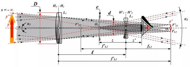 可是這樣觀察太陽會嚴(yán)重?fù)p傷視網(wǎng)膜。于是我們用一個屏幕,在右端遠(yuǎn)處接收穿過目鏡的光線,就能在屏幕上得到一個倒立的太陽的像。由于圖中兩條紅色虛線的張角固定,所以屏幕距離目鏡越遠(yuǎn),接收到的太陽的像的直徑就越大(但太遠(yuǎn)容易模糊)。