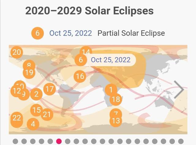 之后到2022年10月25日,中國西部地區(qū)能再次看到日偏食(黃色區(qū)域標(biāo)號6)。北美洲未來的兩次日食將出現(xiàn)在2023年10月14日(在北美洲西南部可以觀測的日環(huán)食,紅色飄帶標(biāo)號8)和2024年4月8日(北美洲南部和東部可觀測的日全食,紅色飄帶標(biāo)號9)。
