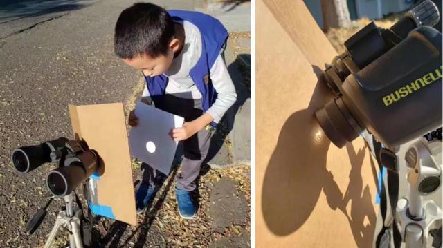 首先,把望遠(yuǎn)鏡固定好,物鏡對著太陽方向;再用一個足夠大的紙板環(huán)繞望遠(yuǎn)鏡遮光,營造一個大范圍較暗的背景,以便觀察太陽的像;在垂直陽光方向用一個白紙板做接收屏幕;調(diào)整屏幕的距離和角度直到成像令人滿意(原理會在文末介紹)。如果是雙筒望遠(yuǎn)鏡可以選擇遮掉一側(cè)物鏡。