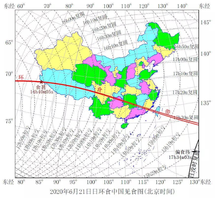 2020年6月21日將會發(fā)生一次難得一見的日環(huán)食。整體食甚(月球?qū)μ栒趽醵嗟臅r刻)將發(fā)生在北京時間下午2:40:04,此時太陽在中印邊界的正上方,全國大部分地區(qū)都可看到日偏食。日食可觀測區(qū)會一直向東移動,在此后的兩小時內(nèi)西藏、四川、貴州、湖南、江西、福建和臺灣等地的一些城鄉(xiāng)將依次迎來日環(huán)食景觀。盡管各地的偏食景觀可持續(xù)兩三個小時,但環(huán)食只持續(xù)若干分鐘并只在很小范圍內(nèi)可見。中國各地從西到東將觀測到環(huán)食(或者偏食食甚)的時間會在下午兩點半到四點十五分之間變化(點擊鏈接https://www.timeanddate.com/eclipse/in/china/xiamen可查詢各城市食甚時間)詳情可見模擬視頻:視頻內(nèi)時間為通用協(xié)調(diào)時 (UTC, Universal Time Coordinated,請前往《返樸》觀看視頻),加上八個小時就是北京時間。