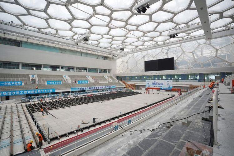 【“水立方”即將變身成“冰立方”】游泳中心(“水立方”)正通過“水冰轉(zhuǎn)換”改造工程成為世界首例在泳池內(nèi)搭建冰壺賽道的冬奧場(chǎng)館。