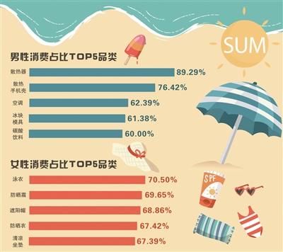 京東大數(shù)據(jù)的全國(guó)用戶畫像顯示,男性消費(fèi)者不忘給自己的電子裝備降溫,而女性消費(fèi)者則注重自身的防曬,時(shí)刻讓自己“白白的”。男性消費(fèi)占比TOP5品類是散熱器、散熱手機(jī)殼、空調(diào)、冰塊模具、碳酸飲料,男性占比分別達(dá)到89.29%、76.42%、62.39%、61.38%、60.00%;女性消費(fèi)占比TOP5品類:泳衣、防曬霜、遮陽(yáng)帽、防曬衣、清涼坐墊,女性占比分別達(dá)70.50%、69.65%、68.86%、67.42%、67.39%。