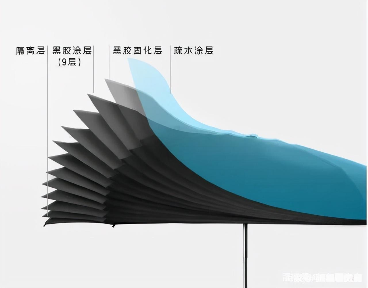 這么高的遮陽(yáng)才能首要是由于它的9層黑膠涂層隔層和外層210T 70D高密柔布(市面慣例為190T 75D),幫你層層擊潰紫外線。