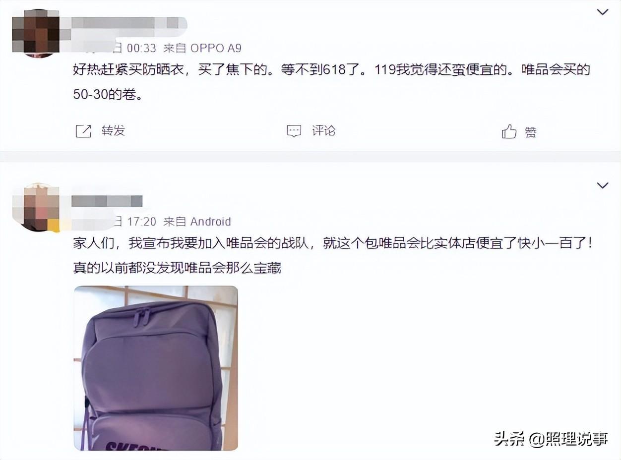4月以來(lái),部分地區(qū)升溫,有網(wǎng)友在唯品會(huì)入手某大品牌的防曬衣,竟然比其他平臺(tái)優(yōu)惠了30—50;還有小姐姐安利大家加入唯品會(huì)戰(zhàn)隊(duì),一模一樣的品牌雙肩背包,唯品會(huì)快便宜了小100。